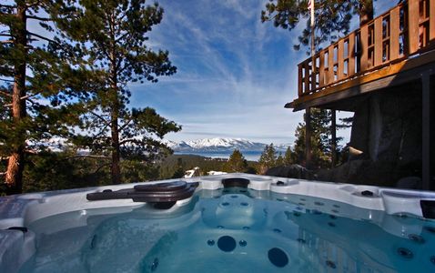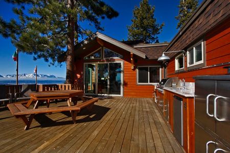ALL OVERLOOKING PANORAMIC VIEWS OF Lake Tahoe, Mt. Tallac and Gunbarrel at Heavenly. Enjoy spectacular sunsets over the lake framed by snow capped peaks and breathtaking views of moon and stars at night. Upper deck with large picnic table, chaise lounges, pub seating and 2 gas copper fire bowls. Lower deck with same incredible views and hot tub for 8.