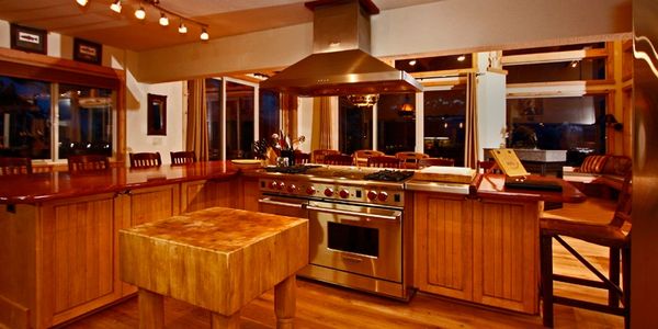Professionally stocked Gourmet Kitchen. African hardwood countertops. Large island bar w/seating for 14. Stainless appliances: 4 burner Wolf range with 2 ovens and double griddle. Hoshizaki ice machine (espresso, latte, coffee). Custom SS sink w/double drainboards and faucets.